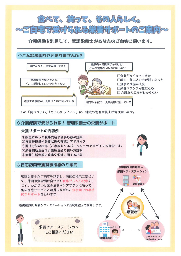 栄養や食生活改善などの専門的な研修を受けた管理栄養士・栄養士が担当します。